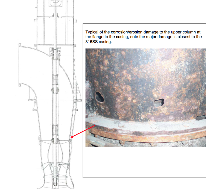 CGA evaluated the damage and devised a corrective action plan until a new column could be fabricated. Fabrication of the new column had minimum of a six to eight week lead-time in 316SS. Due to the severe erosion and unknown actual thickness of the column, removing the unit would probably have done more damage to the other stainless components (shafting, inner columns, casing), and in-place repair was the only option. The column was dimensionally recorded and a new carbon column was fabricated in sections. A new lower flange was also constructed in sections. Prior to installation, these components were prepared by blasting to near-white metal and utilizing special primers. Extreme caution was taken to record the suction bell position prior to installing the components, and was monitored closely during the repair to correct any distortion causing misalignment of the center-line.